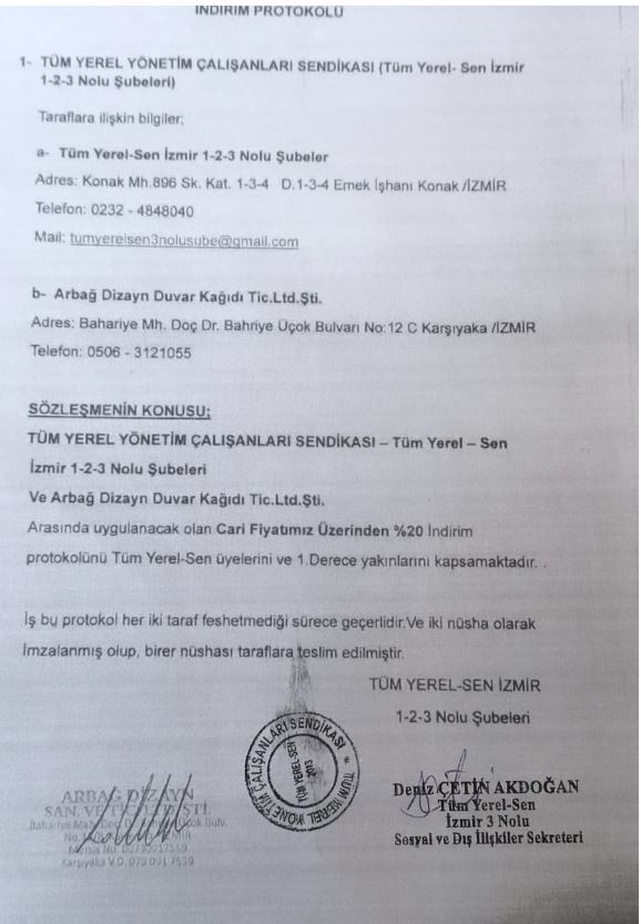 ŞUBE YÖNETİMİMİZ ARBAĞ DİZAYN DUVAR KAĞITLARI TİC. LTD. İLE % 20 İNDİRİM PROTOKOLÜ İMZALADI.BU KAZANIMIN TÜM ÜYELERİMİZE HAYIRLI OLMASINI DİLERİZ.