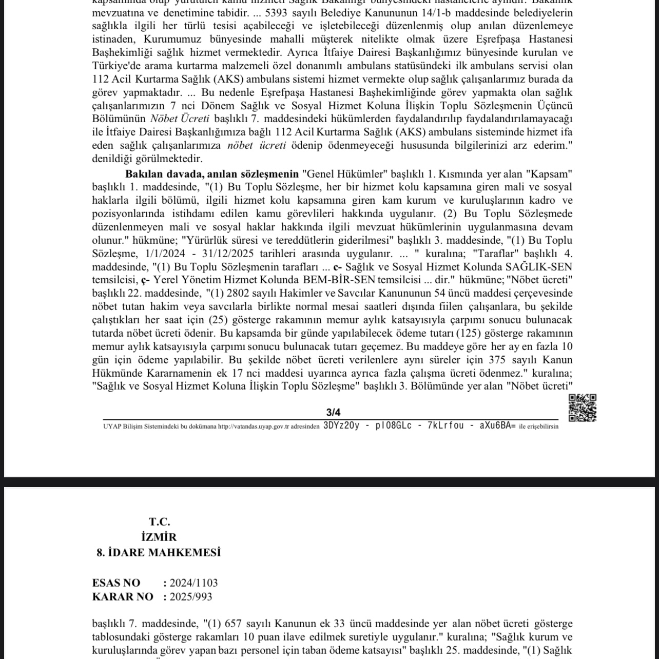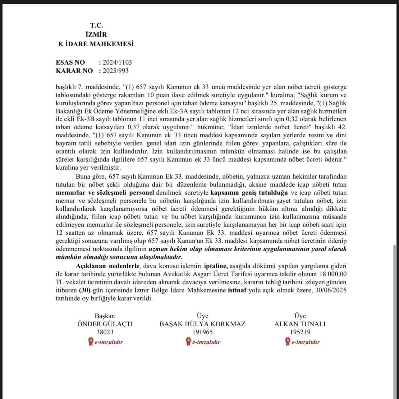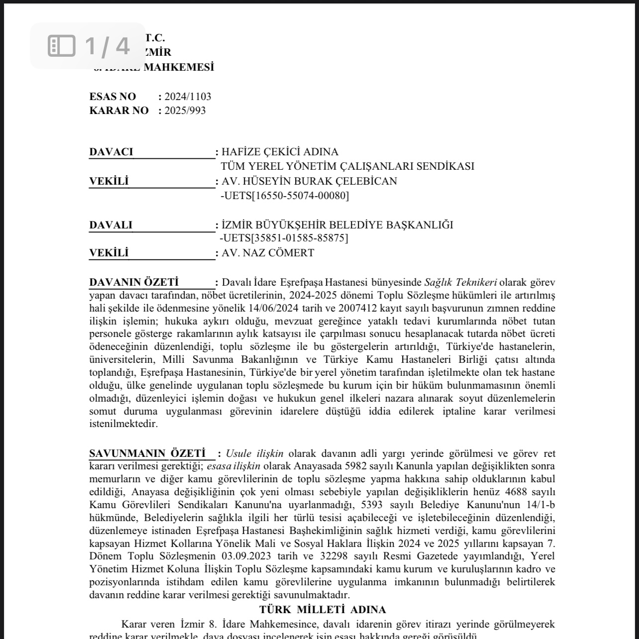 Sendikamız tarafından desteklenen ve İzmir 8. İdare Mahkemesi’nde açılan, Eşrefpaşa Hastanesi ile 112 Acil Kurtarma Sağlık (AKS) sisteminde görev yapan sağlık çalışanlarının 7. Dönem Toplu Sözleşme hükümleri çerçevesinde artırımlı nöbet ücretlerinden faydalanması talebine ilişkin dava, üyelerimiz lehine sonuçlanmıştır.
