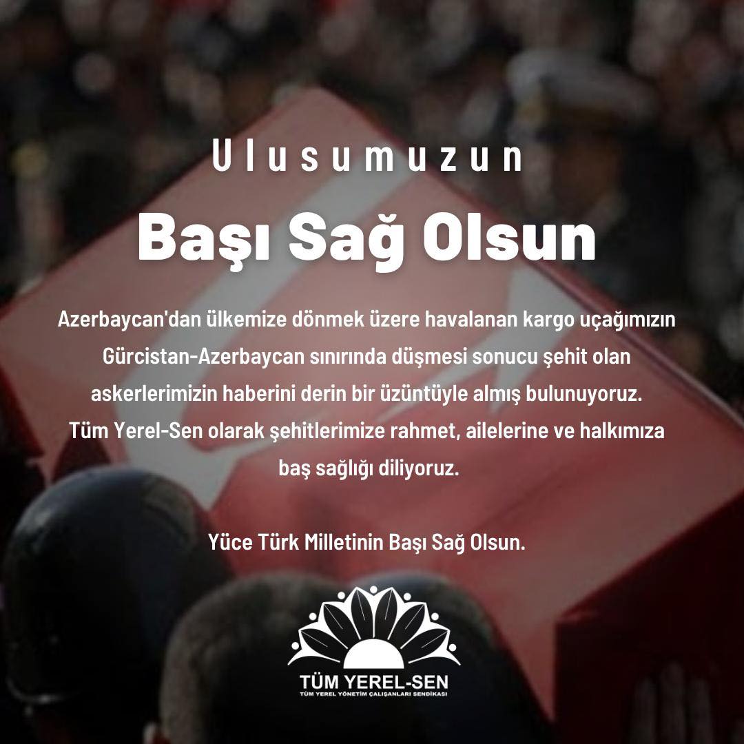 Azerbaycan'dan ülkemize dönmek üzere havalanan kargo uçağımızın Gürcistan-Azerbaycan sınırında düşmesi sonucu şehit olan askerlerimizin haberini derin bir üzüntüyle almış bulunuyoruz. Tüm Yerel-Sen olarak şehitlerimize rahmet, ailelerine ve halkımıza baş sağlığı diliyoruz.