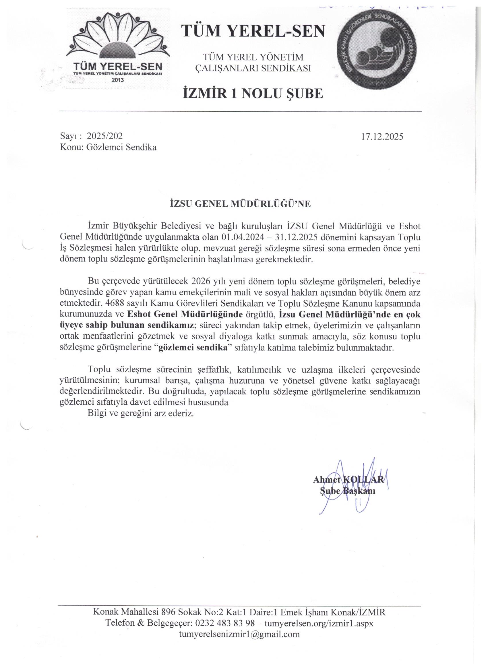 Değerli emekçiler; Bildiğiniz üzere; Tüm Yerel Sen Sendikası olarak geçmiş dönemde İzmir Büyükşehir Belediyesi, İZSU ve ESHOT Genel Müdürlüğü bünyesinde görev yapmakta bulunan tüm memurları ilgilendiren Toplu İş Sözleşmesi kapsamında yoğun bir mücadele vermiş, sürece katkı sağlamak adına elimizi taşın altına koymaktan bir adım geri durmamıştık. Gelin hep beraber bu süreci kısaca hatırlayalım.  (19.12.2024)