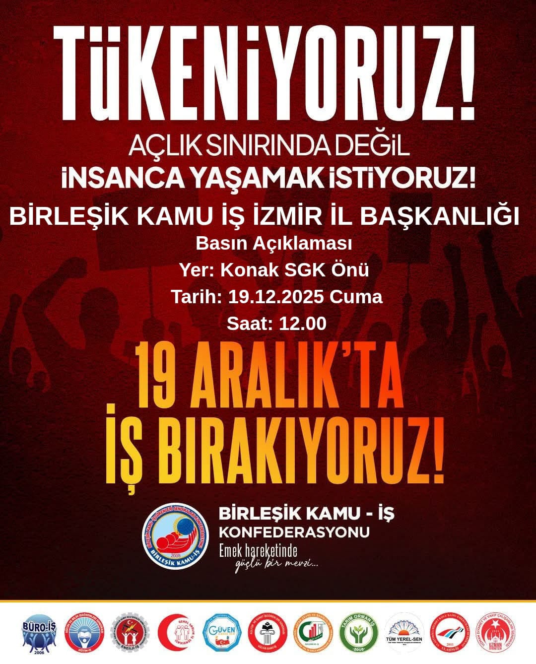 19.12.2025 Cuma günü ülke genelinde üretimden gelen gücümüzü kullanarak tüm kamu çalışanların katılımıyla bir (1) gün iş bırakma eylemi yapılacaktır. Tüm belediye ve kurumlara eylem ile ilgili yazılarımız gitmiştir.  (18.12.2025)
