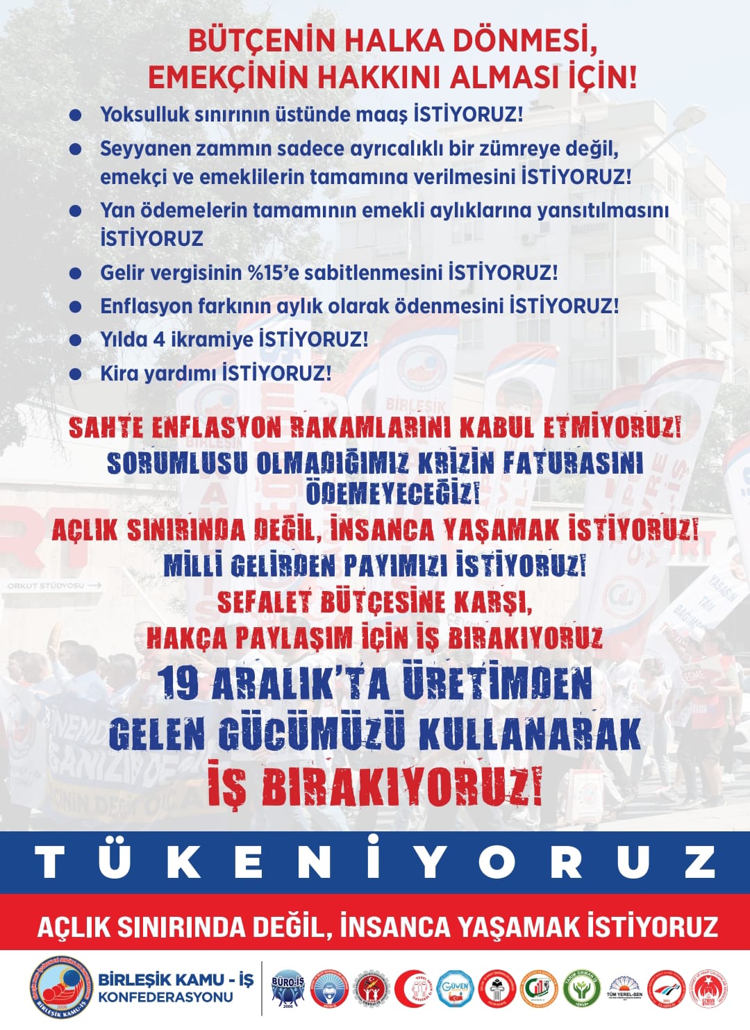 Birleşik Kamu-İş Konfederasyonu, derinleşen ekonomik kriz ve adaletsiz bütçe planlamalarına karşı 19 Aralık'ta üretimden gelen gücünü kullanarak ülke genelinde iş bırakma kararı aldı. Yoksulluk sınırının 93 bin lirayı aştığı bir dönemde, emekçilerin haklarını savunmak için meydanlara ineceğini duyuran konfederasyon; gelir vergisinin %15’e sabitlenmesi, insanca yaşanacak ücret ve kira yardımı gibi hayati taleplerini sıraladı.
