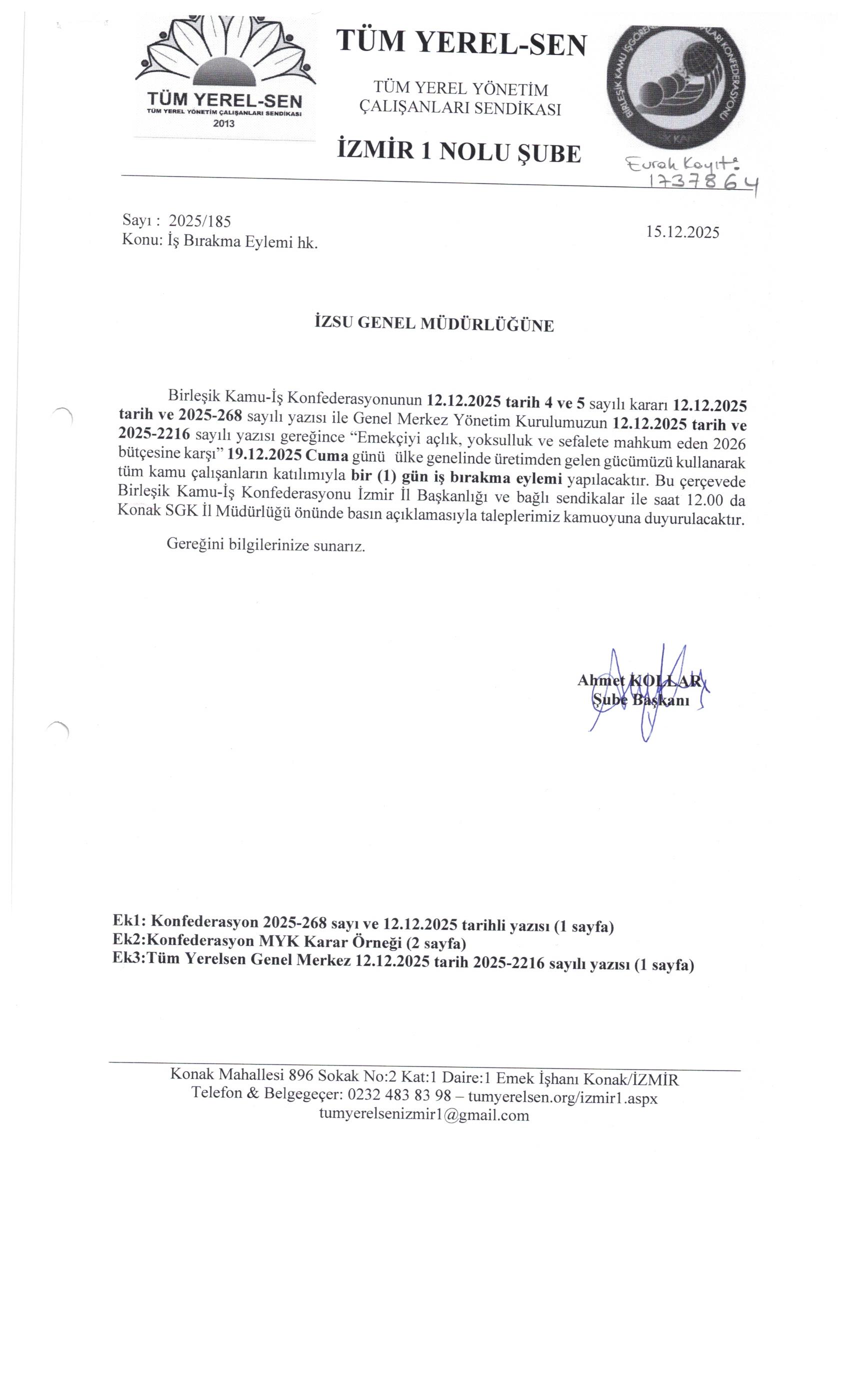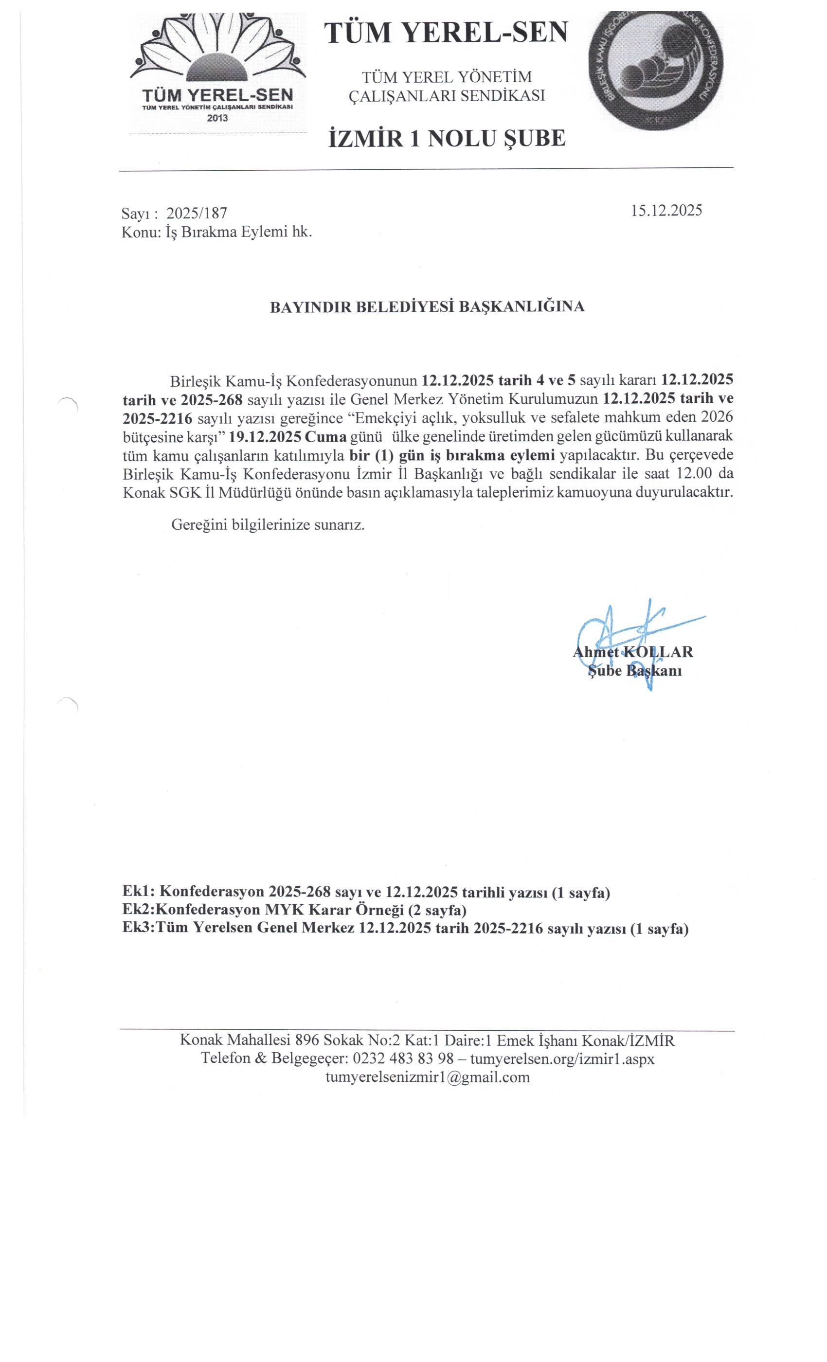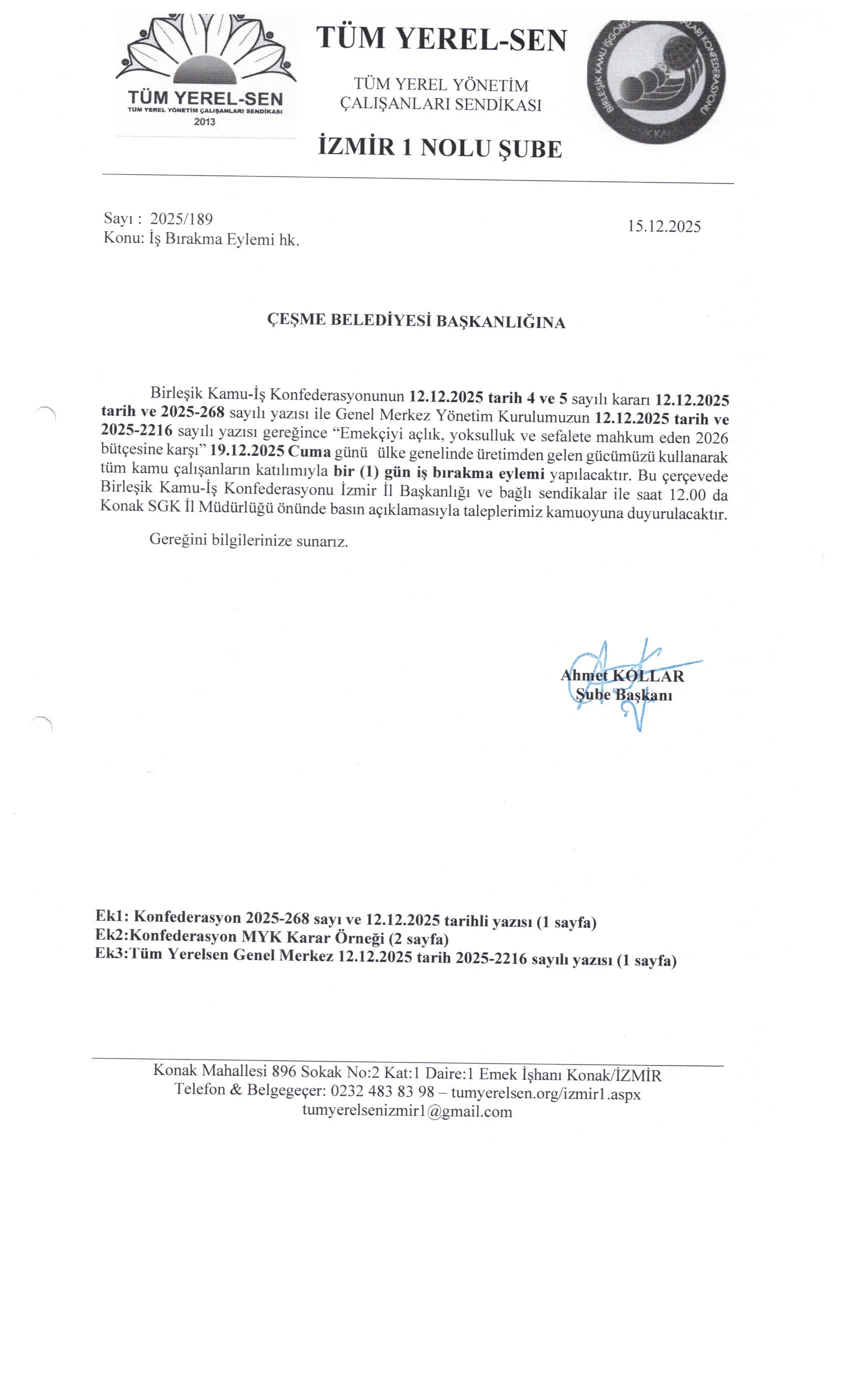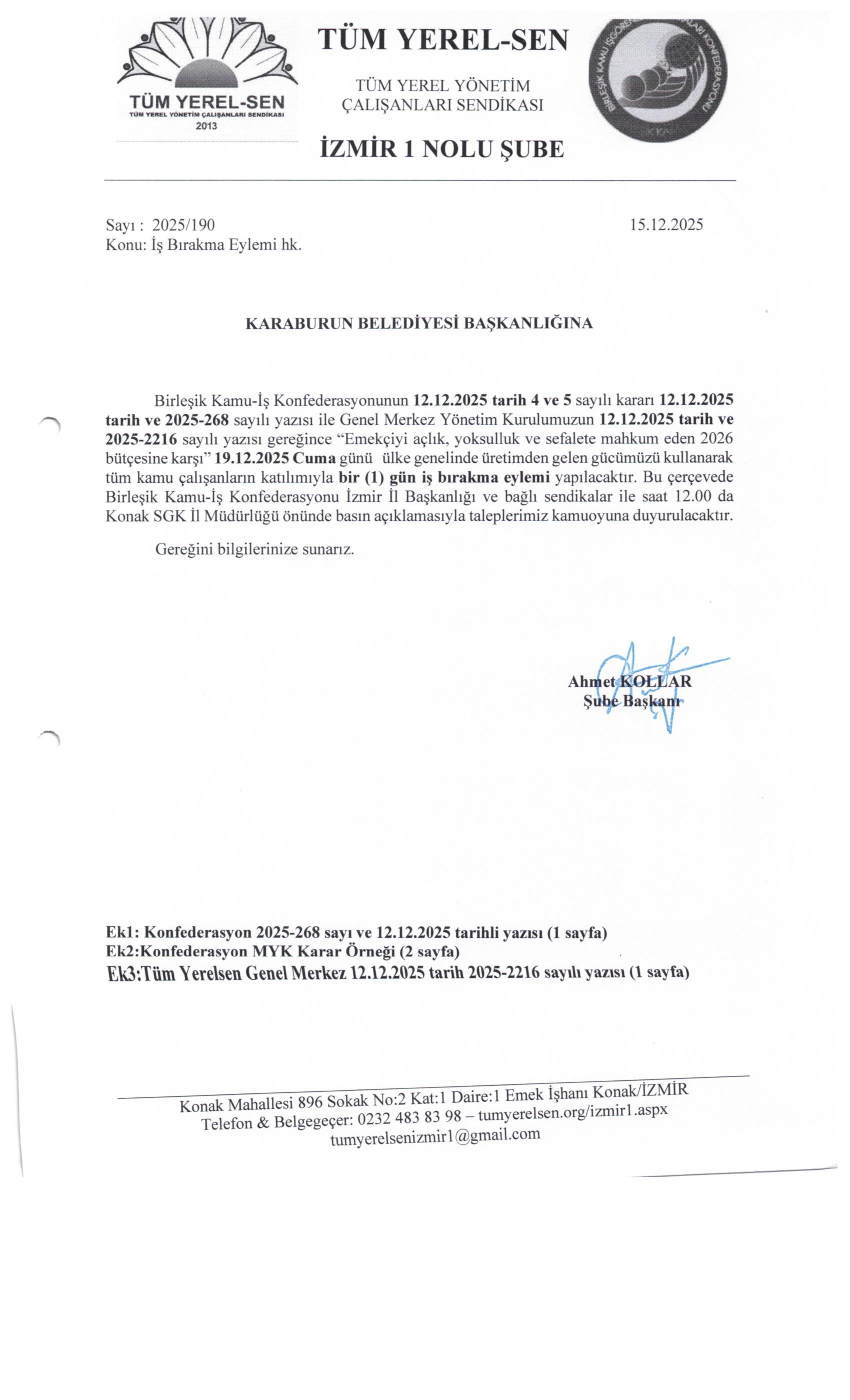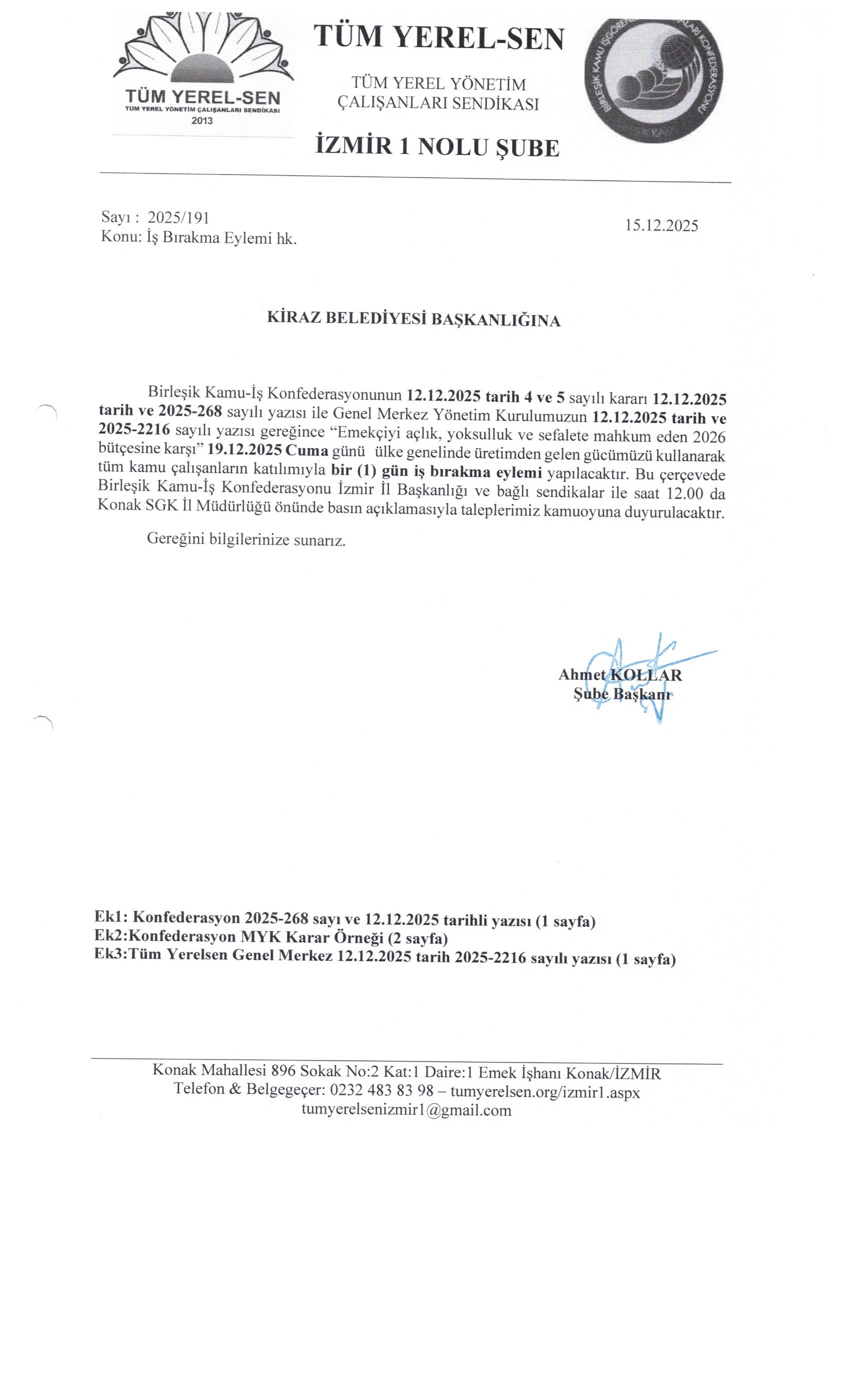 19.12.2025 Cuma günü ülke genelinde üretimden gelen gücümüzü kullanarak tüm kamu çalışanların katılımıyla bir (1) gün iş bırakma eylemi yapılacaktır. Tüm belediye ve kurumlara eylem ile ilgili yazılarımız gitmiştir.