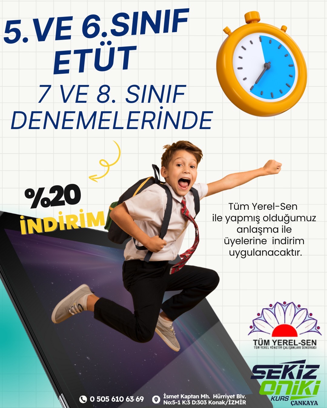 Bilgi ve teknolojinin tüm çalışma alanlarında belirleyici olduğu bu dönemde, çocuklarımızın eğitimine katkı sağlama hedefiyle hareket eden sendikamız, aynı vizyonu paylaşan Çankaya ve Kemeraltı Sekiz On İki Eğitim Kursları ile bir indirim protokolü imzalamıştır.